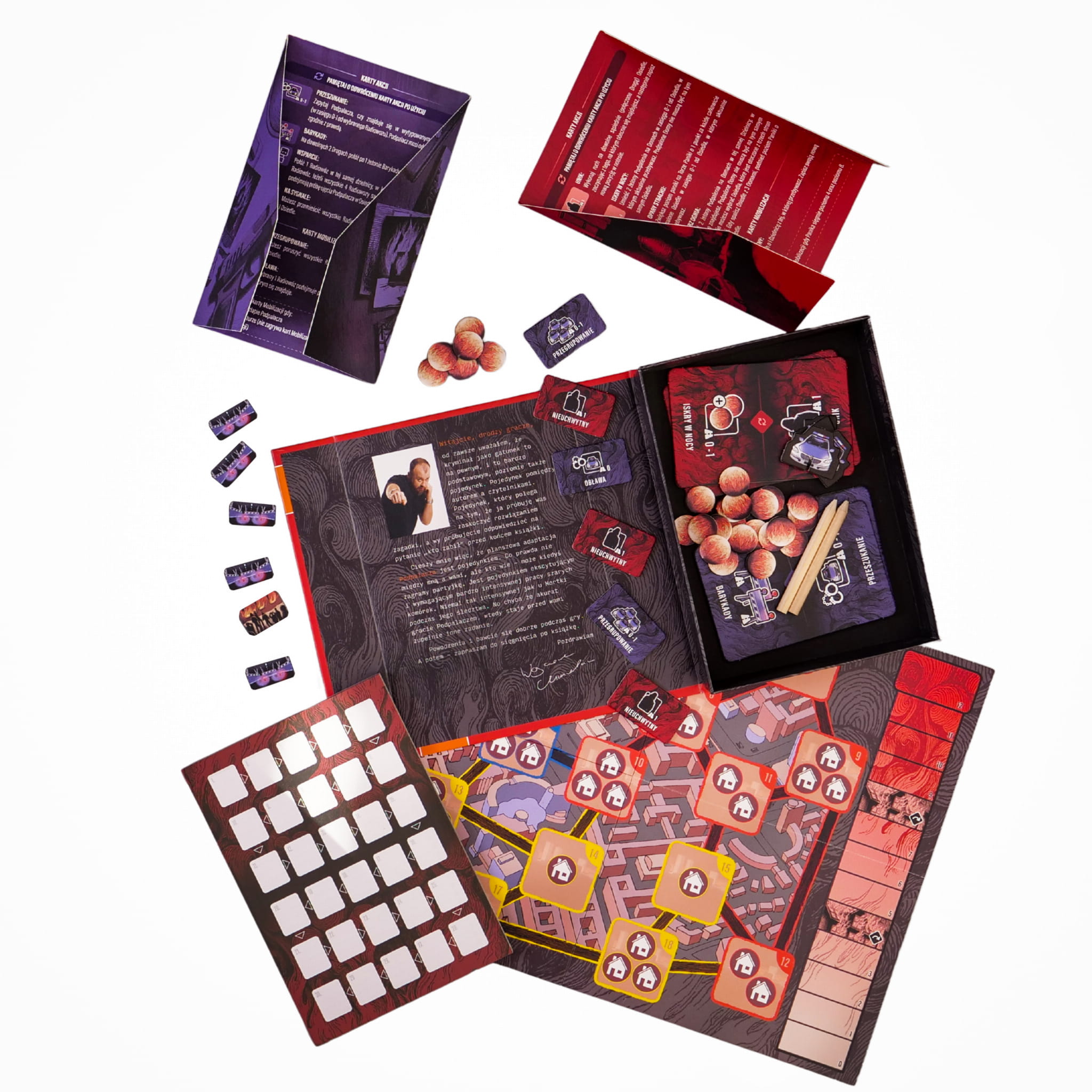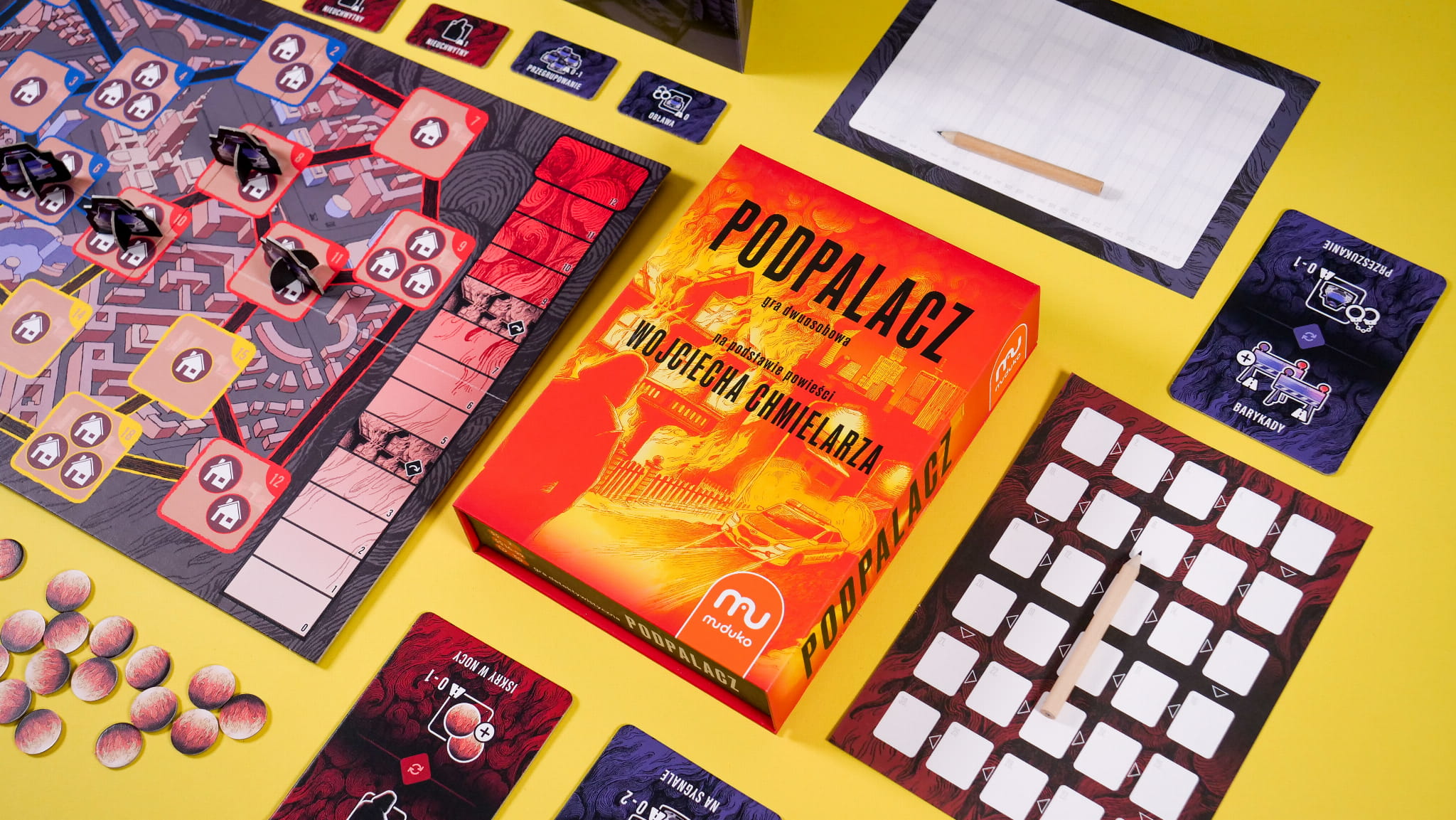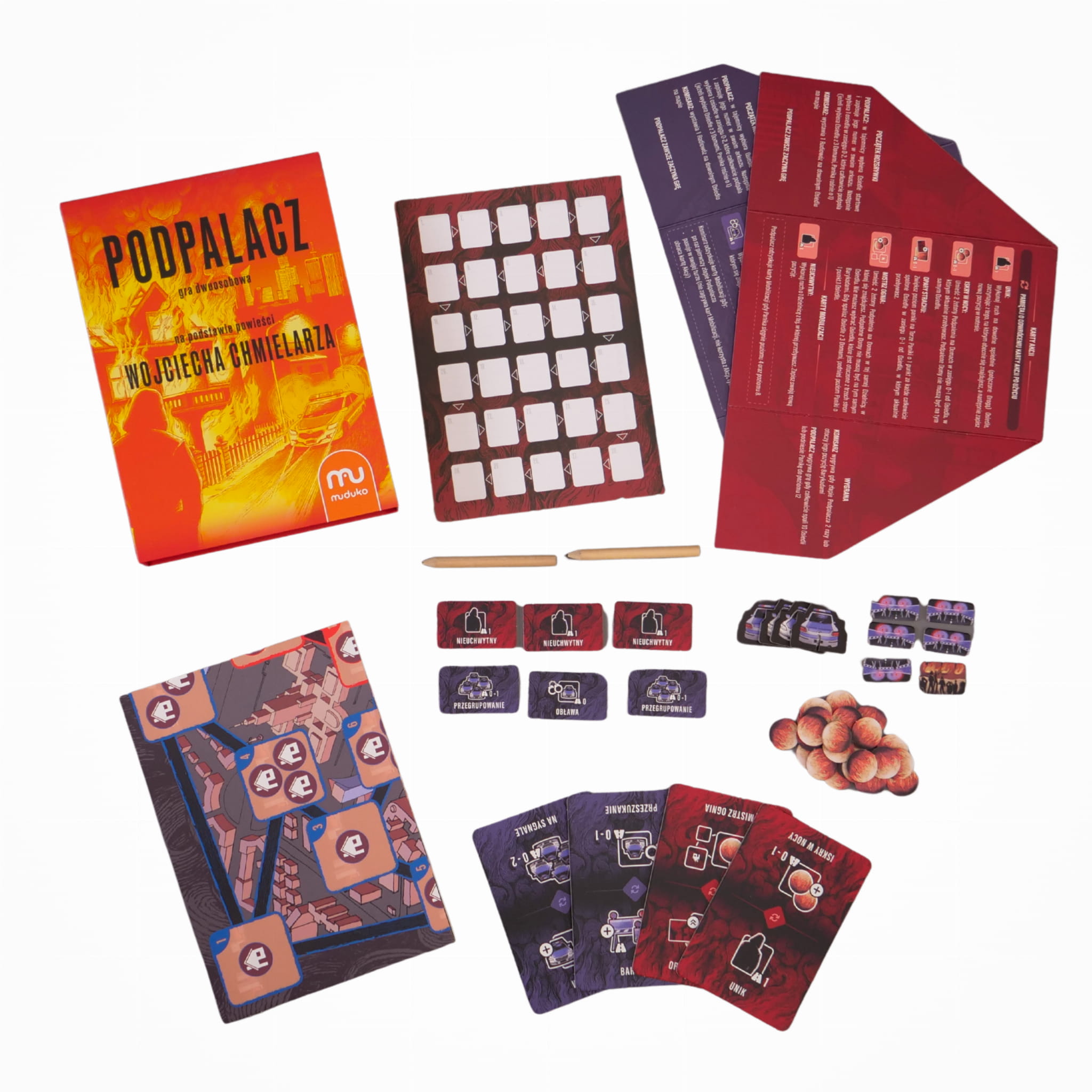 Wcielcie się w postać komisarza lub tajemniczego podpalacza w tej emocjonującej grze planszowej inspirowanej książką Wojciecha Chmielarza. Obserwujcie rozwój sytuacji na planszy, notujcie i podejmujcie strategiczne decyzje. Wybierajcie najlepsze karty akcji spośród dwóch dostępnych, używajcie żetonów podpaleń i policji, przewidujcie ruchy